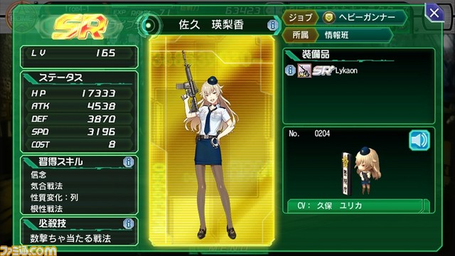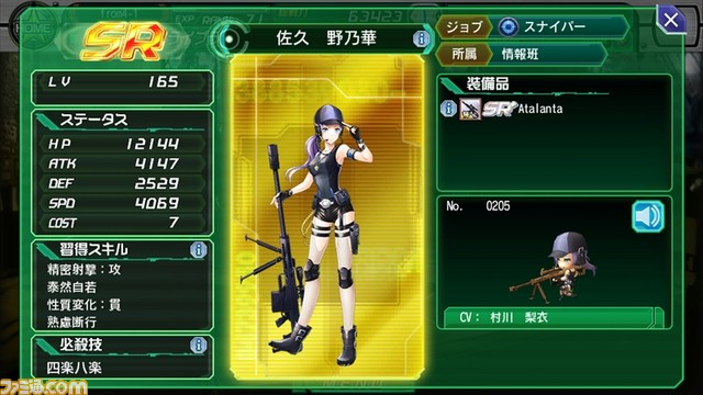 情報班所属であり、佐久姉妹の姉。通常攻撃が貫通変化するスキルを持ち、後列の敵も狙い撃つことができる。敵の攻撃力をダウンさせ、妹の火力をより引き出すことが可能。