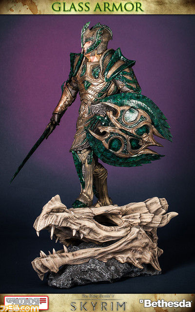 オープンワールド・アクションRPG『ジ・エルダー・スクロールズV: スカイリム』アイテムをリリースするゲーミングヘッズから、『ジ・エルダー・スクロールズV: スカイリム』に登場する「ガラスアーマー」を大型スタチュー化。マラカイト、ムーンストーンなどにより精製される防具「ガラスアーマー」を着用したハイエルフを1/6スケール(全高約38センチ)で造型。ディテールにこだわったアーマー、手に持つソードとシールドなどの装飾部に造型された緑色のガラス部は透明レジンを使用。ポリストーン製となった本体とともに、ゲームグラフィックのイメージを忠実に再現。フルカラーパッケージとなったボックス、手書きナンバリング封入となったコレクティブルな逸品。全世界1000体限定。