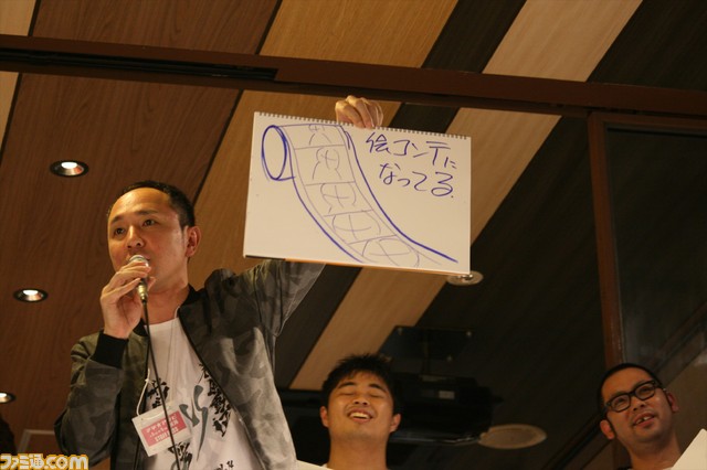 最後は、「アニメーターが、トイレの個室に残したラクガギはどんなラクガキ」というお題。松山氏がいちはやく手を挙げネタを発表にかかる。司会の平井氏やギャラリーは下ネタの予感に身構えていたが、放たれたのは以外にも「トイレットペーパーが絵コンテになっている」という、マイルドな大喜利。松山氏のいきなりの方向転換に戸惑う会場だったが、実はこのネタは米村氏の書こうとしていたネタを先回りして“パクった”ものであることが判明した。松山氏の厳しい「部下いじり」には、爆笑とブーイングが浴びせられた。