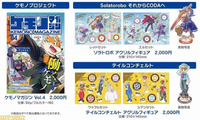 サイバーコネクトツーは、2016年5月3日に開催された“けもケット5”にて先行販売した“ケモノマガジンVol.4”をはじめ、『Solatorobo それからCODA へ』、『テイルコンチェルト』などの新商品の販売を、本日2016年5月12日(木)より“Amazon.co.jp”、“アリスブックス”、“とらのあな”などで開始した。“コトブキヤ”各店舗などでも順次販売開始する予定。
