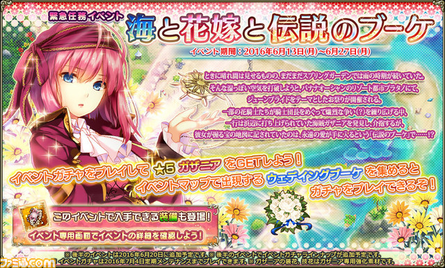 DMM GAMESは、サービス中のファンタジーRPG『FLOWER KNGHIT GIRL』において、2016年6月13日にアップデートを実施。新イベント“海と花嫁と伝説のブーケ”を開催する。