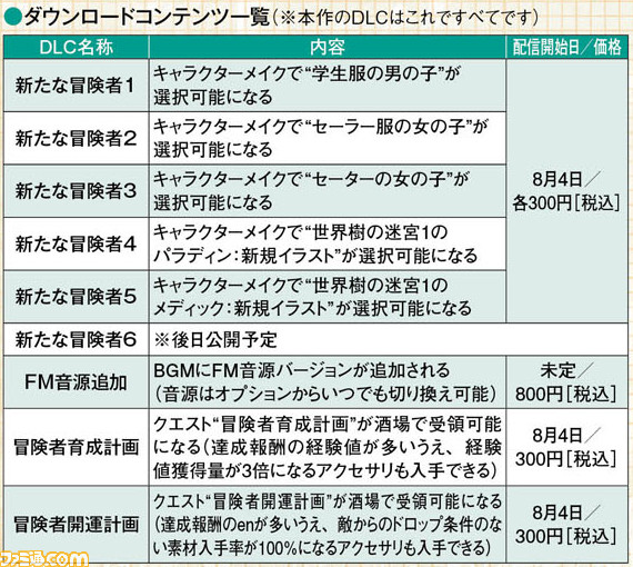 【2016年7月12日18:37記事修正】DLC一覧の価格表記に、正確に伝わらない恐れがある箇所がありましたので、修正いたしました。新たな冒険者1~5の価格は各300円[税込]です。