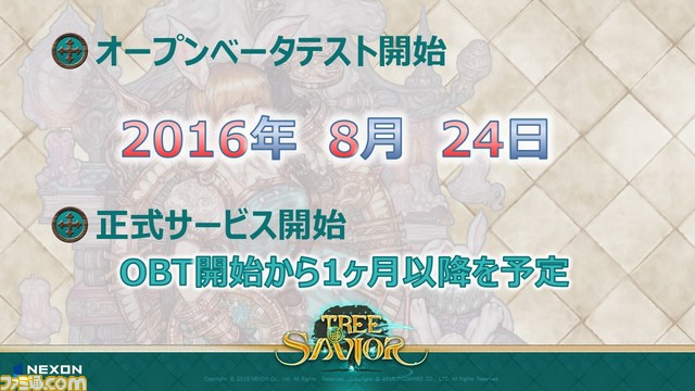 ネクソンは、新作MMORPG『Tree of Savior(ツリーオブセイヴァー)』について、オープンベータテストを2016年8月24日より開始すると発表。あわせて、オープンベータテスト開始から1ヵ月以降に正式サービスを開始することも予定している。