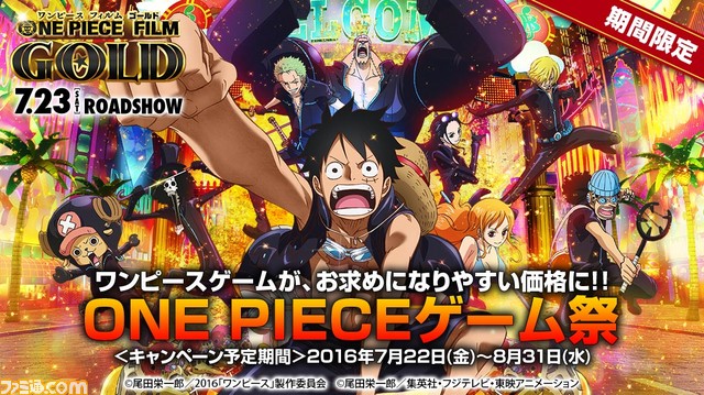 株式会社バンダイナムコエンターテインメントは、映画最新作「ONE PIECE FILM GOLD」(7 月23 日公開予定)の公開を記念して、これまでに発売した『ONE PIECE』ゲームソフトのダウンロード版が期間限定でお求めやすい価格となる『ONE PIECE ゲーム祭』を2016 年7 月22 日(金)~8 月31 日(水)の期間で開催を予定しております。