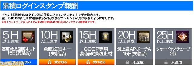 また、継続してログインすることで、獲得したアイテムを保管できる「倉庫」のスロットを拡張できるアイテムやCOOP専用装備の強化を失敗した際に破損を防ぐレアアイテム、上位装備の強化・加工に使用できるアイテムが獲得できます。