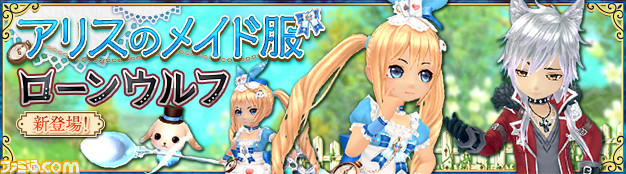 女神・アイナの専属メイドが着用する女性用衣装アバター「アリスのメイド服」と、狼の尻尾が特徴的な男性用衣装アバター「ローンウルフ」が新登場しました。さらに、頭アバター「アリスのツインテール」や「ハーフウルフヘアー」のほか、スプーンの形をした武器アバター「マジカルスプーン」がラインナップしました。職業「ソードマスター」「魔導士」「ウォリアー」「ドラグーン」を選択した際には、戦闘時の攻撃モーションをお楽しみいただけます。