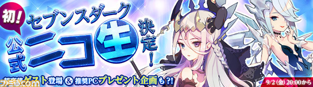 本作の正式サービス開始を記念した、公式ニコニコ生放送を実施することが決定しました!「なるほど・ザ・セブンスダーク~秋の大罪スペシャル~」と題し、本作の醍醐味をたっぷりとお届けします。「色欲」のお色気コーナー!「暴食」の飯テロコーナー!がむしゃら「貪欲」コーナー!など、本作のテーマである「七つの大罪」を背負った出演者陣が、ゲームを徹底的に遊びつくします。視聴者の皆様もご参加いただけるボス討伐イベントや、運営担当がその場で質問にお答えするコーナーほか、推奨PCやリアルグッズなど豪華賞品の視聴者プレゼントもご用意しております。ぜひお友達をお誘い合わせの上ご覧ください。お楽しみに!