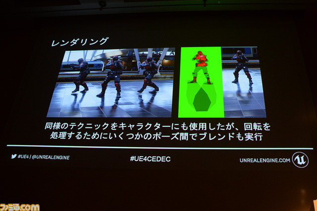 たとえば、『BULLET TRAIN』で登場した、看板が床に反射している図。こちらは反射を計算して描画しているわけではなく、看板のモデルを利用した板ポリゴンを看板の下に配置し、反射らしく見えるようにゆがみを加えて、描画しているそうだ。「このエフェクトを実現するためのマテリアルは、かなり簡単」(コンリー氏)。同様のテクニックは、キャラクターが床に反射する映像でも使用。こちらは足の回転に対応するため、いくつかのポーズを用意し、ブレンドしたそうだ。