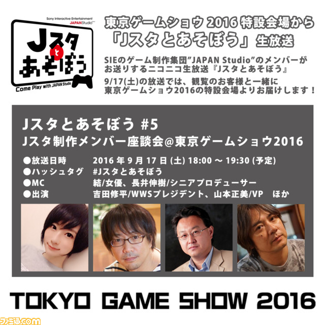 9月15日(木)~18日(日)の4日間、幕張メッセで開催されるゲームの祭典「東京ゲームショウ2016」(以下「TGS2016」)。今回の「Jスタとあそぼう」は、その一般公開日の17日(土)に、なんと現地の特設会場から生放送します! 気になる内容は、PlayStationブースにタイトルを出展しているJAPAN Studioの制作メンバーや関係者をお招きしての座談会! 3日目の終了を迎えた「TGS2016」を振り返りながら、最終日へ向けての意気込みを思う存分語り合います。そのほか、「各々が注目しているタイトル」といった豊富なトークテーマも用意しております。ひょっとすると、生放送ならではのポロリ(発言)が出ちゃうかも……!?
