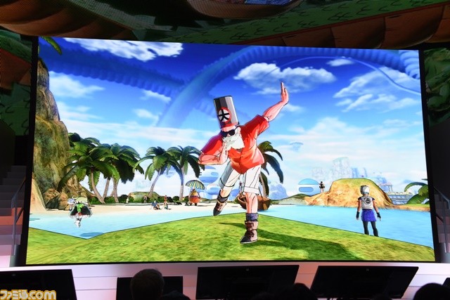 続いては、初公開となる6人協力プレイを披露! 今回プレイを披露する6人は、バンダイナムコゲームスと、本作の開発会社であるディンプスの社員たち。『ドラゴンボール』キャラクターになりきって、壇上に登場した。