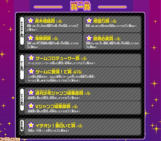 「斉木楠雄賞」、「燃堂力賞」、「海藤瞬賞」、「照橋心美賞」、「ゲームプロデューサー賞」、「ゲームに登場!で賞」、「週刊少年ジャンプ編集部賞」、「Vジャンプ編集部賞」、「イチオシ!面白いで賞」の各賞受賞者のニックネームは本作のスタッフロールに掲載されます。