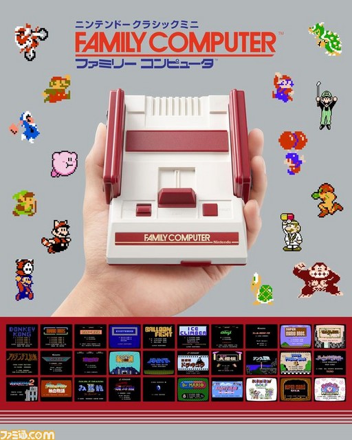 本体の大きさはオリジナルのファミリーコンピュータの約60%と、 コンパクトになっています。 手のひらに乗るくらいのサイズです。 その収録タイトルは10年超の長期にわたり「現役」ハードとしてソフトが供給され続けたファミリーコンピュータの足跡を踏まえ、 多くの「ファミコン世代」に共感いただけるよう、 ハード初期である、 ドンキーコングやマリオブラザーズから、 末期のスーパーマリオUSAや星のカービィ夢の泉の物語まで幅広いタイトルを網羅しています。