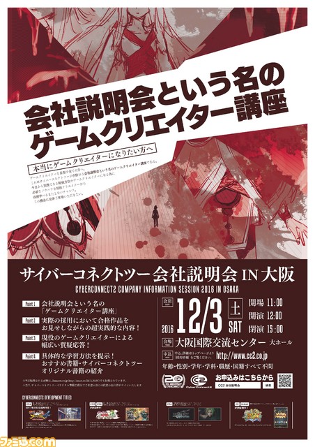 サイバーコネクトツーは、会社説明会という名のゲームクリエイター講座として各地で実施している“サイバーコネクトツー会社説明会”を、2016年12月3日に大阪で開催すると発表した。