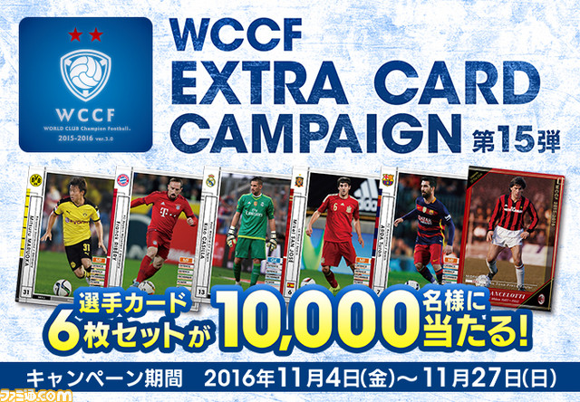 株式会社セガ・インタラクティブは、業務用サッカーゲーム「WORLD CLUB Champion Football(ワールドクラブチャンピオンフットボール、以下WCCF)」を設置している全国のアミューズメント施設にて、2016年11月4日(金)より「WCCF のエクストラカードが当たる『WCCF エクストラカード キャンペーン第15弾』を実施いたします。