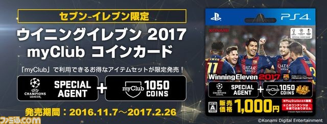 KONAMIは、発売中のプレイステーション4用ソフト『ウイニングイレブン 2017』について、オンラインモード“myClub”で利用できる“ウイニングイレブン 2017 myClubコインカード”の販売を、セブン‐イレブン限定で本日2016年11月7日より開始する。