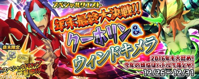 ※“年末最終スペシャルクエスト”の“年末最終大決戦! クーホリン&ウィンドキメラ”は、12月26日16時よりスタート。