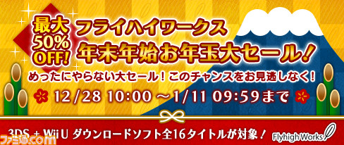 フライハイワークス株式会社はニンテンドーeShopにて、3DS+Wii Uダウンロードソフト 計16タイトルを対象とした「フライハイワークス 年末年始お年玉大セール!」を行います。期間は12/28(水)10:00~01/11(水)09:59まで、最大50%の特大セールです。