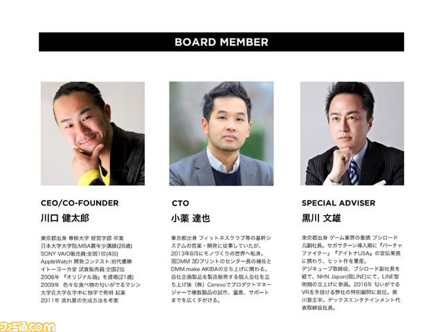 発表会の会場には、“VAQSO”(バクソー)のCEO、川口健太郎氏が登場。このVAQSOは、今回の匂いが出るVRデバイス用アタッチメントのために設立された会社で、2017年1月に設立。川口氏は、これまでに匂いを取り扱う企業、ZaaZを起業・運営してきていたが、今回新たなデバイスを作るにあたり、シリコンバレーでスタートアップをして、勝負をしかけたいとの思いから、この新会社を設立したとのこと。VAQSOのボードメンバーは、川口CEOのほかに、DMM.make AKIBAの立ち上げにも関わった小薬達也氏がCTOに加わり、“黒川塾”でもお馴染みの黒川文雄氏がスペシャルアドバイザーとして名を連ねている。