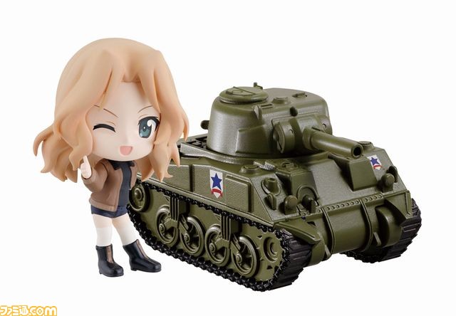 サンダース大学付属高校の隊長「ケイ」と、M4シャーマン 75mm砲搭載型のフィギュアのセットです。戦車にキャラクターを乗せて飾ることもできます。