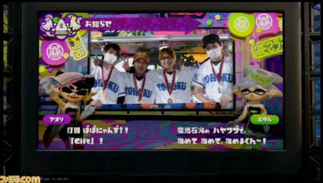 決勝大会が始まると、第1回と同様にハイカラニュースでシオカラーズのふたりがチームを紹介。その後スタート地点に立ったプレイヤーたちが登場。ゲーム内のギアブランドがスポンサーを務めるユニフォームに身を包み、ウグイス嬢(MCを務めていた齋藤あかねさんが兼任)が選手名を読み上げながら代表者が入場した。会場には、多くのイカ好きが駆け付けて声援を送っており、『Splantoon(スプラトゥーン)』の魅力を改めて感じるとともに、発売から1年半以上が経過してもまだまだ続く人気の高さを実感できた。