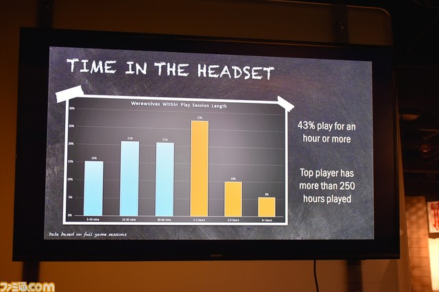 プレゼンでは、アーリー氏は、それまでVRコンテンツは“動きが大きすぎると気分が悪くなる人が多い”、“短くなくてはいけない”、“非社会的なものである”と言われてきたが、「私たちの経験からそうではなかった」(アーリー氏)と断言。以前、とある調査で“ひとつのセッションは7分まで”と言われていたそうだが、Ubisoftでは目標時間を10分に設定。実際『イーグルフライト』では、73%のセッションが10分以上とのこと。また、『Werewolf within』という同社のVRタイトルでは、半分以上が30分以上のセッションだったという。さらには、「トッププレイヤーは、最初の60日間で250時間以上をプレイしていた」という驚きの数字も紹介された。アーリー氏によると、プレイヤーはVRコンテンツに「ふつうにプレイしているような典型的な大型ゲームを求めていることがわかった」という。