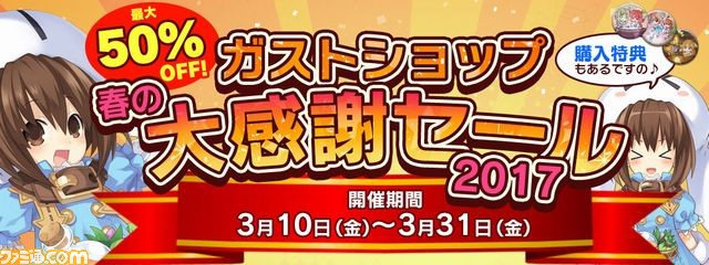 コーエーテクモゲームスのガストショップでは、ガストブランド商品をお買い得価格で購入できる“ガストショップ春の大感謝セール2017”を本日2017年3月10日(金)より開始した。人気商品が最大50%OFFで購入できるほか、購入金額に応じてガストショップオリジナル購入特典もプレゼントされる。