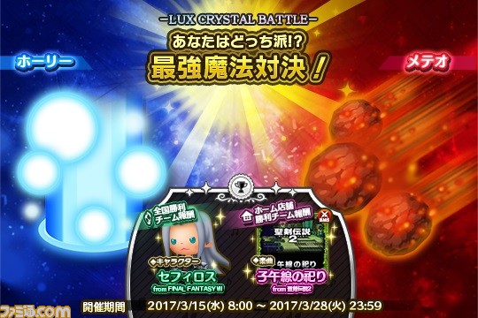 プレイヤーが2つのチームに分かれてポイントを競う「ルクスクリスタルバトル」の7回目がスタート! 今回は最強魔法対決です。全国勝利チームにはキャラクター「セフィロス」が、店舗勝利チームには楽曲「子午線の祀り」(聖剣伝説2)が贈られます。