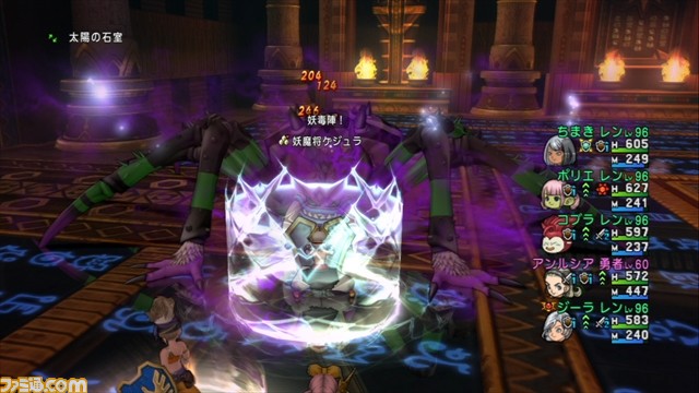 妖魔将ゲジュラとの戦いで超危険なのが“妖毒陣”。エリア全体にダメージを与えてきて、食らうと必ずチカラ尽きてしまう攻撃です。妖毒陣に合わせてアンルシアがすぐに結界を張ってくれるので、その中に逃げ込みましょう。これでダメージを受けることもチカラ尽きることもなくなります。