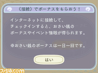 期間限定の「季節衣装」や「もののけ退治イベント」に参加するためには、インターネット接続し、“チェックイン”する必要があるぞ。チェックインすると、イベント情報のほか、ゲーム中でなにかと役立つおさい銭のボーナスもゲットできるので、毎日チェックインしよう!