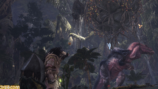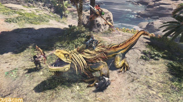 E3 2017で公開されたフィールド“古代樹の森”に加え、新たに“大蟻塚の荒地”が登場。スクリーンショットでは、乾燥地帯と沼地が入り混じる荒地での狩りの模様が見られる。