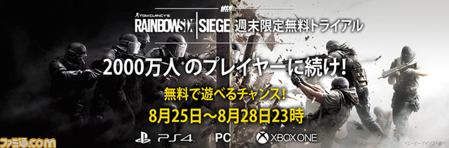 また新オペレーションの追加を記念して、8月25日よりPlayStation4版、Xbox One、PC版で無料トライアルの実施が決定いたしました。週末限定のトライアル版は8月25日(金)から8月28日23時(月)の期間限定で『レインボーシックス シージ』を無料でお楽しみいただけます。トライアル版のセーブデータはそのまま製品版に引き継ぐことができます。