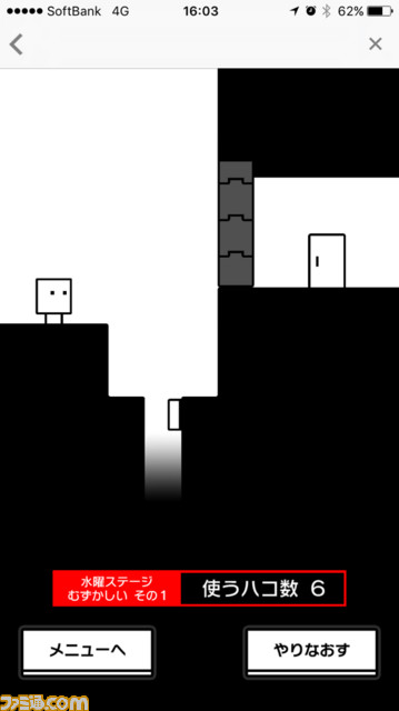 ユニクロアプリ版のルールはかんたんで、主人公のキュービィくんをタップして“ハコ”を捻り出し、前方に投げてゴールへの道を作る。ただし、投げた“ハコ”が壁にぶつかったり、穴に落ちたりしないように、ぴったり地形にフィットする足場を作らなくちゃいけない。