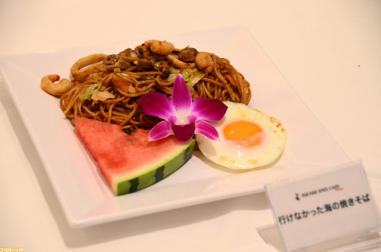 シーフード焼きそばにカットスイカと目玉焼きが。トワイライトタウンで、ロクサスやハイネたちが夏の海で食べるはずだった焼きそばを連想する、夏の思い出が蘇る一品。860円[税込]