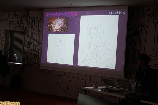 最初に画面に映し出されたのは、『コードヴェイン』の最新バージョン。東京ゲームショウで公開されたバージョンよりも開発が進んでいるもので、開発環境を持ち込んでの披露となった。東京ゲームショウが終わった後、「アクションのスピード感をもっと上げてほしい」というプレイヤーの意見がとくに多かったとのことで、アンリアルエンジン4での開発環境を活かし、その場で“スピード重視”に設定したキャラクターの戦闘を見せることになった。