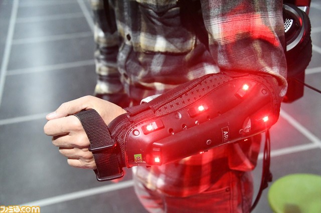 プレイにあたっては、VRゴーグル、バックパックPC、ハンドガン、VRマーカーの設備を装備。VR空間でのバトルに臨んだ。モーションキャプチャーシステムは、約10キロとのことだが、いちばん重量のあるバックパックPCをリュックサックの要領で背負うこともあってか、さほど重いという感じはしなかった。