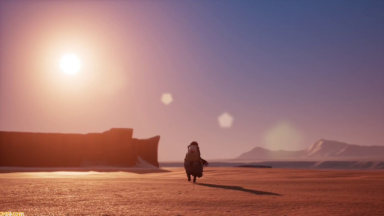 戦闘シーンも入っていて剣と銃で戦うシーンが見られる。初期の映像では寄りの画面で戦っていることもあったが、今回は引きのままの戦闘。銃でロックオンすると命中率らしきものが表示されていて、敵の距離によって変動している様子。馬かロバのような生物に騎乗しながらの銃撃だが、命中率を見ながらなら間合いの調整もやりやすそう。