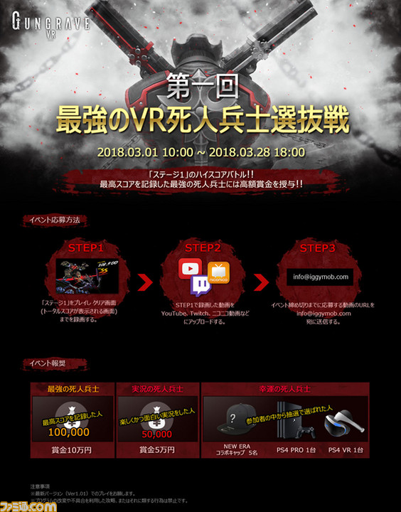 IGGYMOBから配信中のプレイステーション VR対応ソフト『GUNGRAVE VR』。同作に多大なるインスパイアを与えたプレイステーション2用ソフト『GUNGRAVE O.D.』の発売14周年を迎え、ゲーム内イベント“最強のVR死人兵士選抜戦”が実施されることになった。この“最強のVR死人兵士選抜戦”は、ステージ1のスコアを競うイベントで、応募者の中で最高スコアを記録した方を“最強のVR死人兵士”として表彰する。そのほかにも、実況に関する部門や参加者の中から抽選で豪華景品があたるプレゼントのチャンスも!