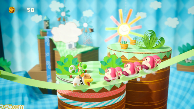 ヨッシーが冒険するのは、裏と表がある、クラフトの世界。表側から見たステージと、裏側から見たステージで、ひと味違うプレイが楽しめそうだ。