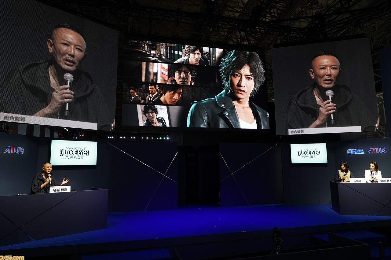 ステージでは現在公開中のプロモーション映像が改めて紹介されたが、「龍が如くスタジオ作品の軸はちゃんとあって、ファンの方の期待は裏切らない作りだけど、ちゃんと新しくなっている」と感想を語るMCUさんのコメントを受けて、名越監督は「(『JUDGE EYES:死神の遺言』は)リーガルサスペンスというジャンルながら、やりたかったのは熱いドラマ。ゲームは人間のエモーショナルなものを揺さぶる力を持っている」とし、『龍が如く』シリーズとは違う角度から、「また明日からがんばって生きていこう」とプレイヤーを元気づけられるようなものを目指した、と制作に懸ける熱い想いを明かした。