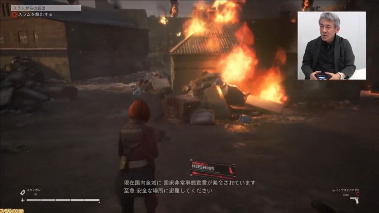 放送では、まずは『LEFT ALIVE』とはどういったゲームなのか、鍋島氏が簡単に説明した。本作は、突然戦争が発生し、戦場になった街からの脱出を目指すアクションゲーム。脱出の中で戦争に隠された陰謀が明らかになっていくとのこと。