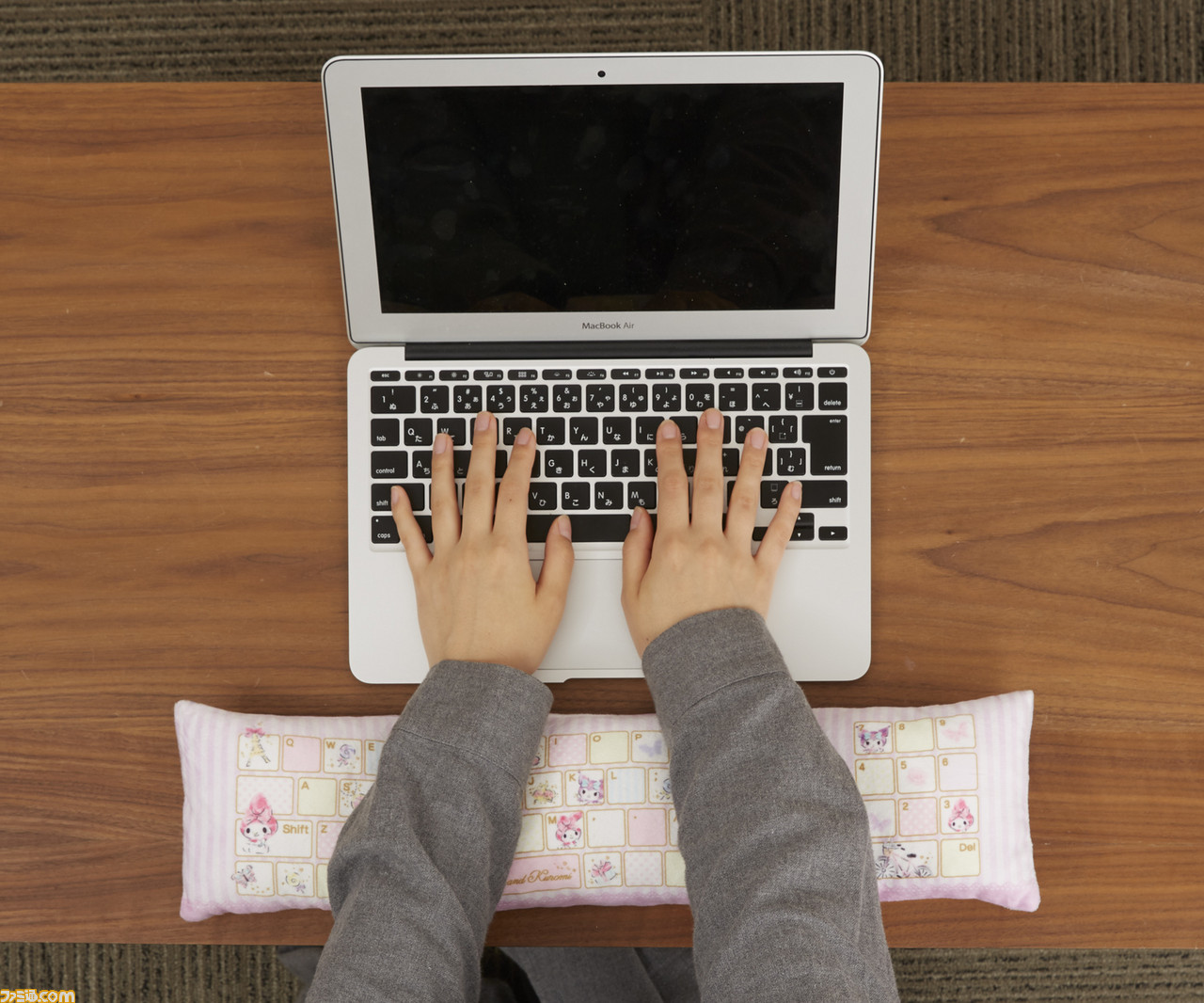 優しい色合いと表情に癒される、ふわふわ可愛いぬいぐるみと、表面がかわいいキーボードデザイン、裏面が柔らかいイラストとなった表裏使えるアームレストのセットです。