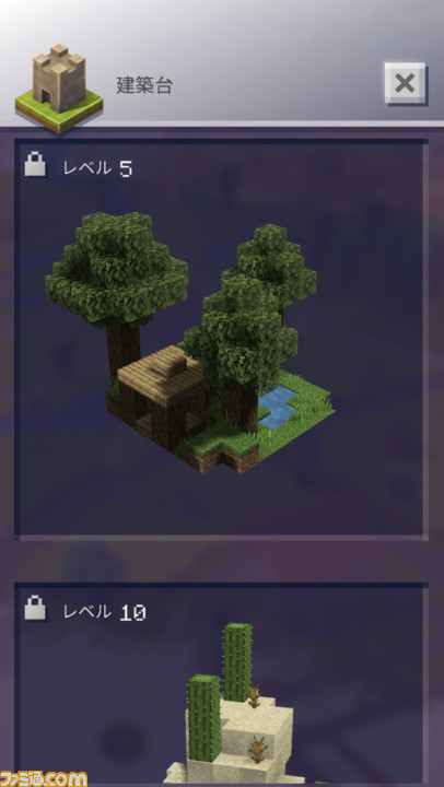 なお、この建築台は、あらかじめ木が植えられていたり建物が建っていたりして、本家『マインクラフト』の世界から一部を切り取ってきたかのような構成だ。カスタマイズした結果はちゃんと保存されるため、たとえばここの全ブロックを壊して入手すると、岩盤だけの寂しい建築台となってしまう。