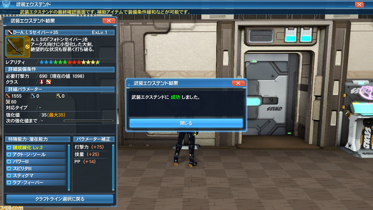 クラフトでは旧式武器のみ武装エクステンドが可能だったが、今回のアップデートから新世武器の武装エクステンドが可能になる。また、新旧問わず★13武器までの武装エクステンドも可能となり、★13武器でも、最終的には★14、★15武器に近い性能まで強化できるように。ただし、★13武器を武装エクステンドで最大まで強化するには、★14、★15の武器を分解して入手できる新たな素材アイテムが必要になる。