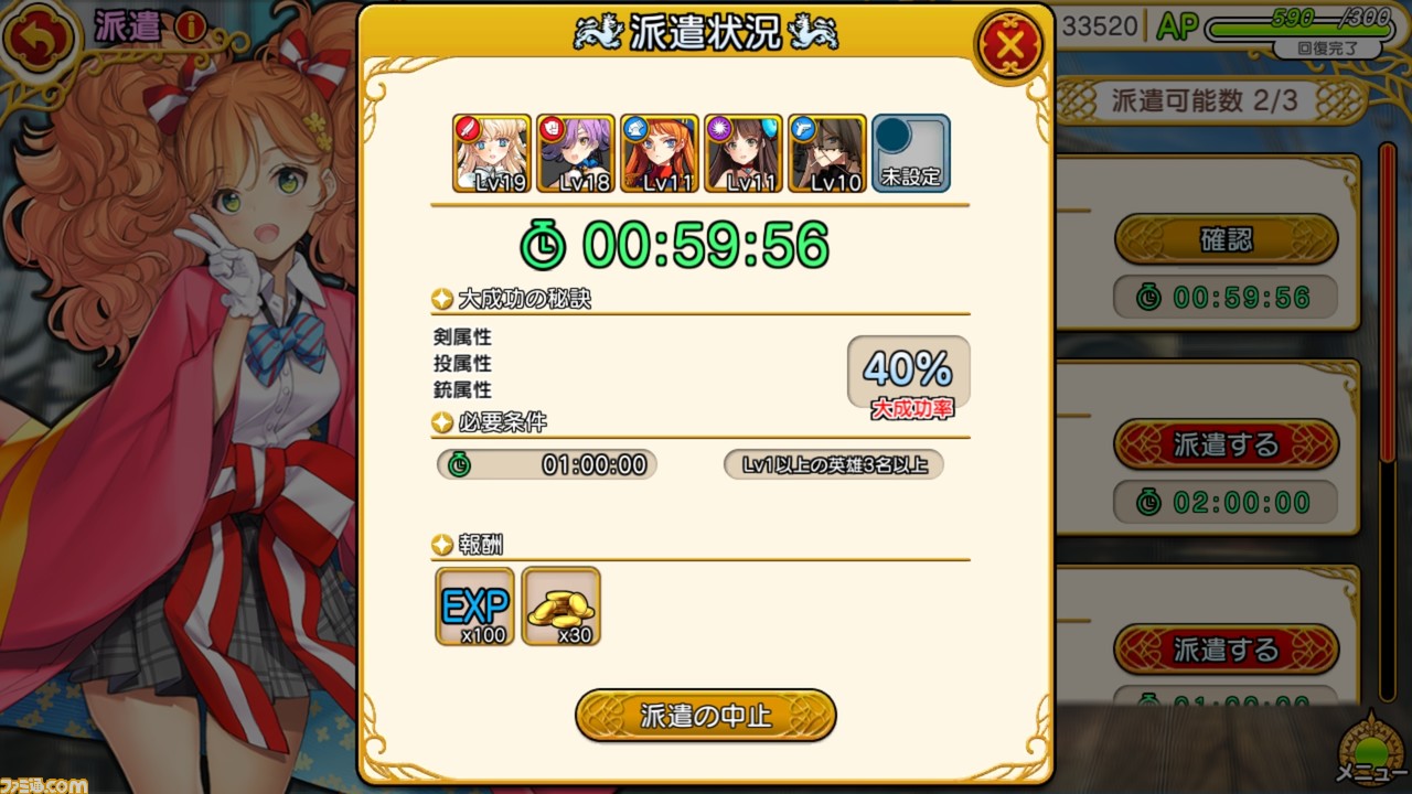 『WW』では、探索マップ(後述)や派遣、チャレンジ、オートプレイといった新要素が追加されている。派遣は、文字通りキャラクターを派遣して経験値や資金などを得る要素。得られる報酬のクオリティーは、派遣に必要な時間によって変化する。これを活用すれば遊んでいない時間でもキャラクターを強化できるのだ。しかも編成中のキャラクターを派遣することもできるので、主力部隊でストーリーを進めつつ、派遣でさらに育成するということも!(超ありがたい!) ガッツリ遊びたい人にとってもうれしい機能と言える。