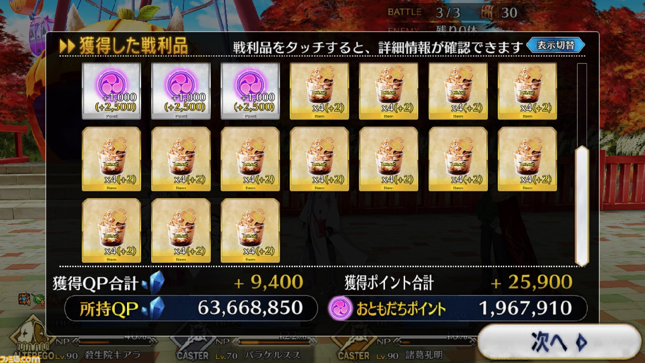 コヅチサンデー周回効率第2位のクエスト“ティーカップ”では“精霊根”と“凶骨”がドロップ。礼装が豊富な場合、コヅチサンデーとおともだちポイントはイベント終盤で余りやすいので、酒呑童子(キャスター)のスキル強化用素材である“凶骨”目当てに“ティーカップ”を周回するのも手です。