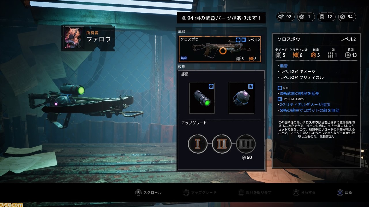 なお、武器にも強化要素があり、ステージで入手できるアイテムを消費して、攻撃力とクリティカル時に与えるダメージを強化できる。さらに、部品を取り付けることで、威力を強化したり、追加効果を発生させられる。部品は着脱可能なので、入手したらすぐに武器に取り付けるだけで性能アップが図れるのは使い勝手がいい。