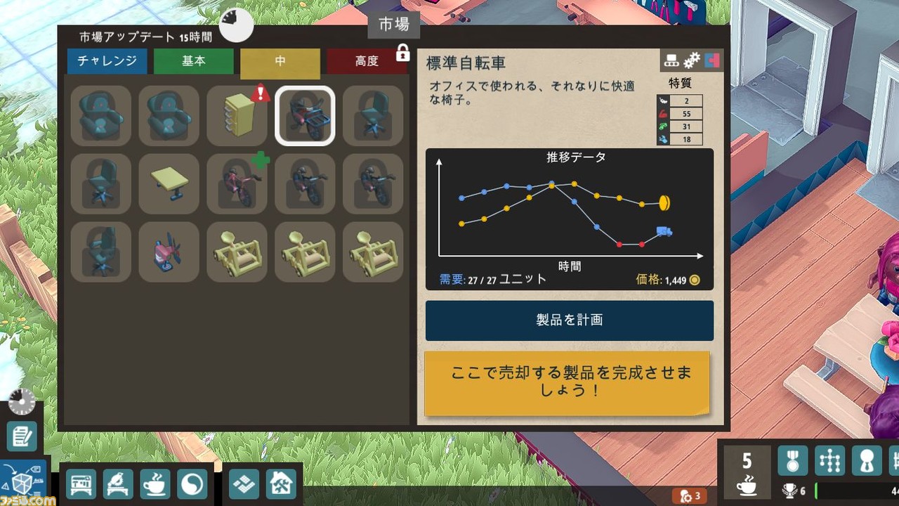 本作における商品作成作業の大半は下準備だ。何を作るのか市場動向を見て決め、設備が足りないなら新たに購入。従業員の作業効率を上げるためのレイアウトも大切で、これらの準備作業はたいへんだが楽しいポイント。逆に作成時の操作は作業の振り分けぐらいだ。従業員の仕事を見届けよう。