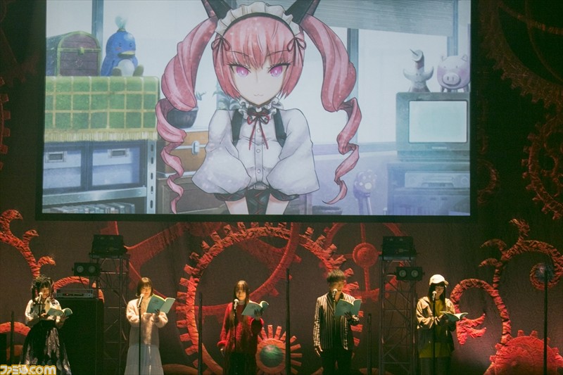 そして、ここで『シュタインズ・ゲート』シリーズを代表する楽曲のひとつ『GATE OF STEINER』が流れ、会場のスクリーンには『シュタインズ・ゲート エリート』のタイトル画面が映し出される。画面には、実際のゲーム画面には存在しない、“朗読劇”の項目があり、それを選択したところで、いとうかなこさんが再びステージに登場。同作のオープニングテーマ『COSMIC LOOPER』を歌い上げ、ゲームさながらの演出で声優陣による朗読劇に突入。
