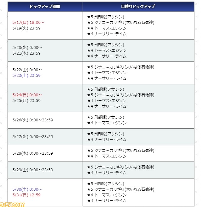 今回は、コラボイベントに関連するサーヴァントの中から、下記のサーヴァントが日替りでピックアップされる。