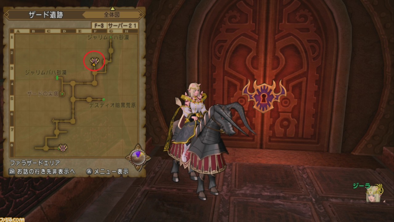 ザード遺跡は、砂の都ファラザードからフィールドに出て東に進めば、すぐに到達できます。ここには扉が2ヵ所あるので見逃さないように。北側の扉にある宝箱の中身はふしぎなきのみと謎の宝珠?、南側の扉にある宝箱の中身は魔伝のかけらと謎の宝珠?でした。